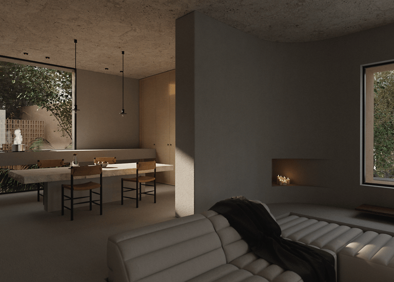 Clean, photorealistic images shaped by light and materiality, designed to highlight spaces, atmosphere, and key design details.